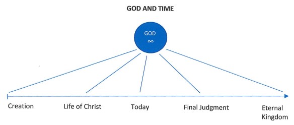 Here God is above time and exists in eternity (∞), but he sees all events and moments in time equally and vividly. He even sees everything that is happening in our eternal state (the arrow pointing on the left). As Hodge said, above, “With Him [our] duration [in time] is an eternal now.” But God interacts with humans in time and reveals himself to us in time. God is eternal and personal, so we can relate to him.
