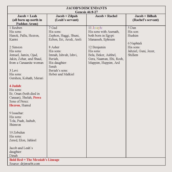 Luke’s genealogy (in reverse order): Hezron ─ son of Perez ─ son of Judah ─ son of Jacob (Luke 3:33-34)
