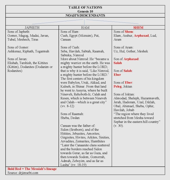 Eber in the third column is where “Hebrew” comes from, though some scholars say Eber is not related to “Hebrew.”